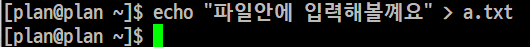 echo "메세지입력" > a.txt 파일안에 텍스트를 추가하게 된다. 파일에 저장됨.